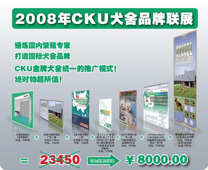 “锤炼国内繁殖专家,打造国际犬舍品牌”是CKU强力推出“2008年CKU犬舍品牌联展”的原发目的,我们更希望能够通过本次11月大型综合犬业活动的机会,让CKU的犬舍品牌以形象化、规范化和系列化集群宣传模式,清晰的展现在到场的纯种犬爱好者和所有的到场观众面前,这项活动将为热爱纯种犬优化繁殖、注重犬舍品牌发展的会员提供了一个能够充分展现个人繁殖成绩和繁殖特点的舞台,更为拓展纯种犬市场提供了一次绝佳的宣传推广机会。